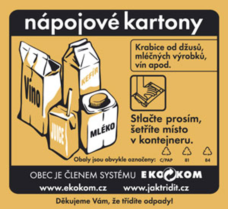 Vzhledem k většímu množství tříděných nápojových kartonů byl posílen svoz a kontejnery na nápojové kartony jsou nově sváženy 1 x měsíčně, tato změna je uvedena v aktualizovaném kalendáři svozů. Nově jsou v kalendáři uvedeny také svozy kovových odpadů.