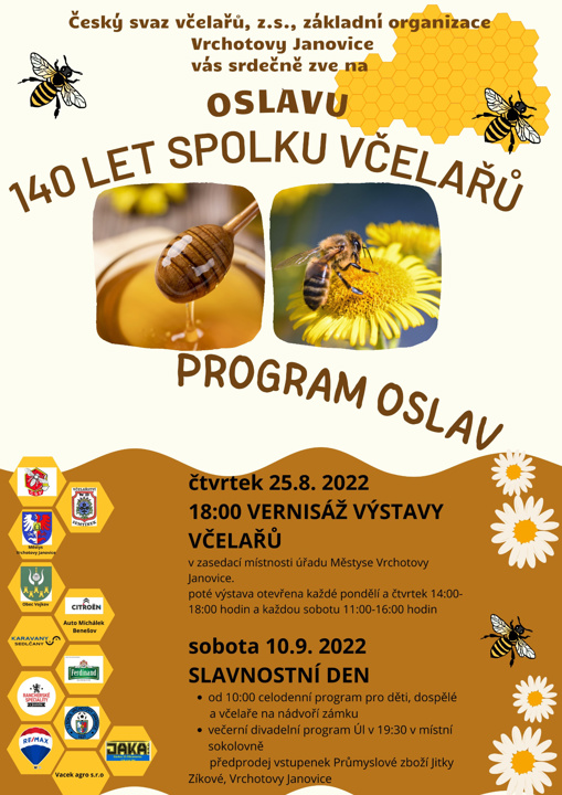 Rádi bychom poděkovali sponzorům a partnerům oslav, městysu Vrchotovy Janovice a předsedovi Sokola Vrchotovy Janovice Antonínu Dvořákovi. Seznam sponzorů a partnerů akce je uveden na webových stránkách včelařů Vrchotovy Janovice.
