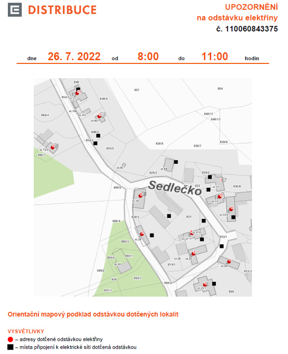 Plánovaná odstávka elektřiny dne 26.7.2022 od 8.00 do 11.00 - Sedlečko.