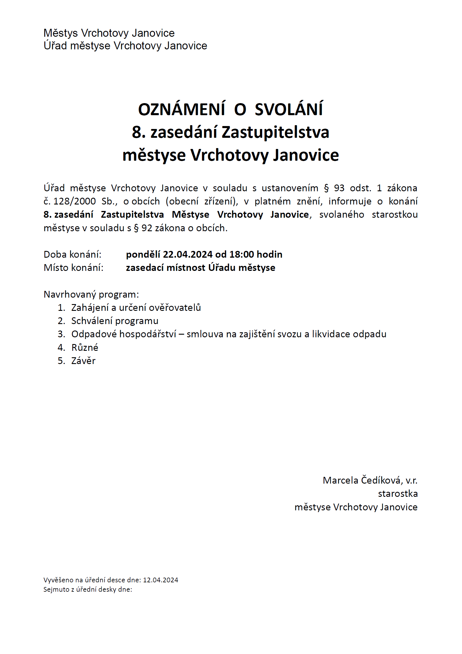 Oznámení o svolání 8. zasedání zastupitelstva, které se uskuteční 22.04.2024 od 18.00 hodin