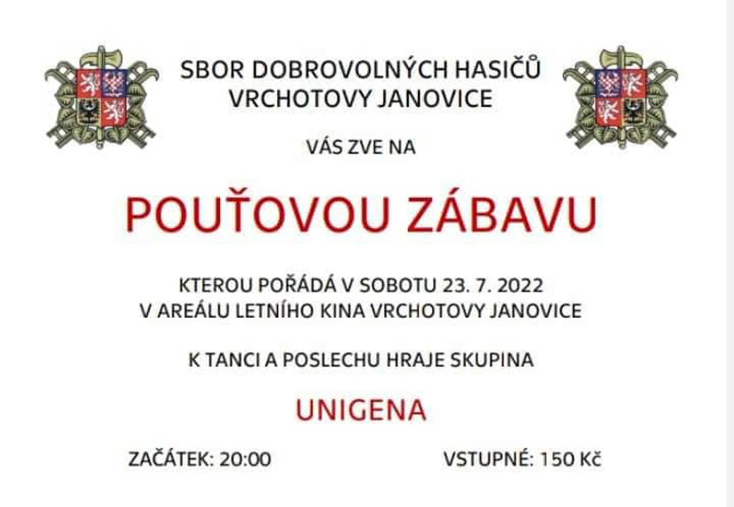 SDH Vrchotovy Janovice pořádá dne 23.7.2022 od 20.00 pouťovou zábavu v letním kině ve Vrchotových Janovicích.