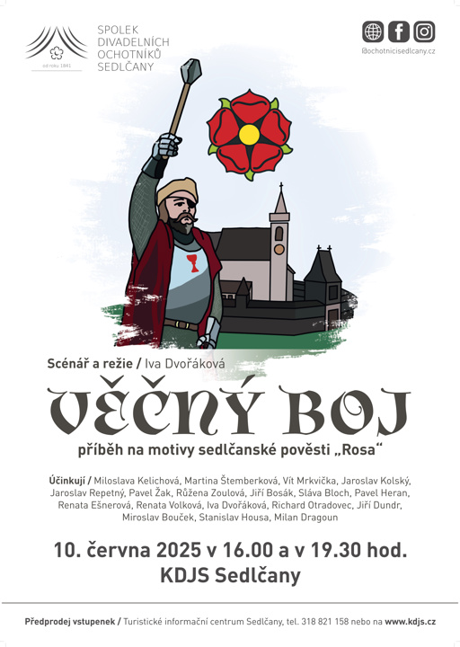 Vstupenky možno zakoupit od pondělí 12.5. 2025 v Informačním centru Sedlčany osobně, nebo online na www.kdjs.cz