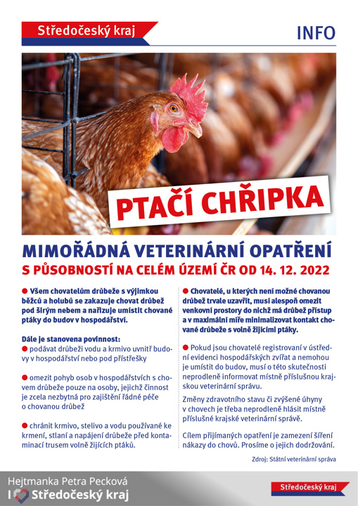 Státní veterinární správa (SVS) z důvodu přibývajících ohnisek vysoce patogenní ptačí chřipky v České republice vyhlašuje mimořádná veterinární opatření s celostátní působností. Všem chovatelům drůbeže s výjimkou běžců a holubů od zítřejšího dne zakazuje chovat drůbež pod širým nebem a nařizuje umístit chované ptáky do budov v hospodářství. Chovatelé, u kterých není možné chovanou drůbež trvale uzavřít, musí alespoň omezit venkovní prostory do nichž má drůbež přístup a v maximální míře minimalizovat kontakt chované drůbeže s volně žijícími ptáky. Cílem přijímaných opatření je zamezení šíření nákazy do chovů.