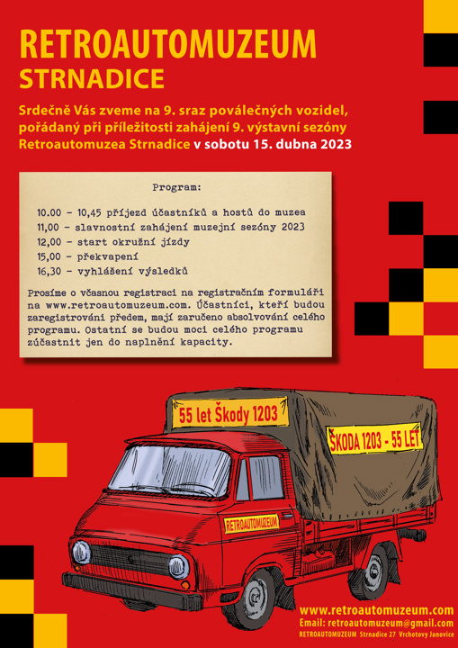 RETROAUTOMUZEUM Strandice srdečně zve na 9. sraz poválečných vozidel pořádaný při příležitosti zahájení 9. výstavní sezóny v sobodu 15. dubna 2023 od 11.00 hodin.