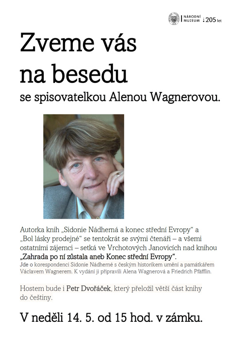 V neděli 14. května 2023 od 15.00 se uskuteční v zámku setkání s paní spisovatelkou, Alenou Wagnerovou, která představí novou knihu "Zahrada po ní zůstala".